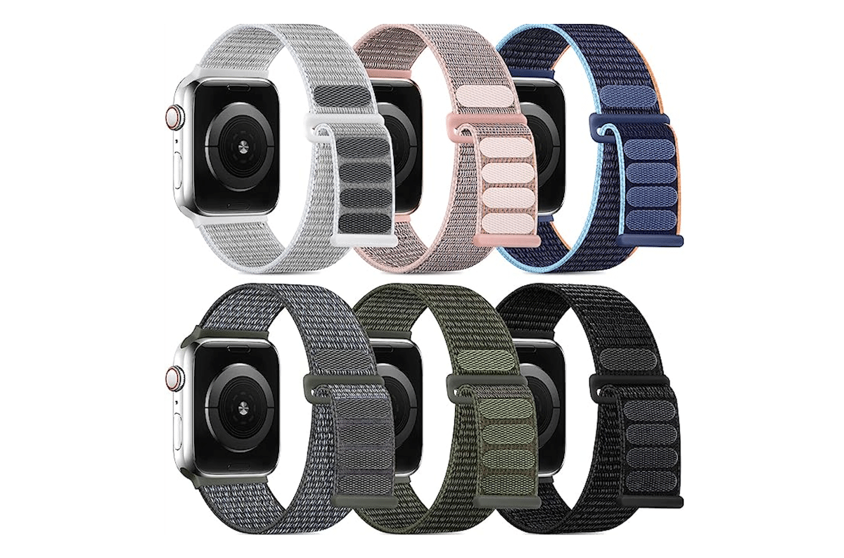 - WJK tarjoaa 6 joustavaa nailonista solosilmukkanauhaa sisältävän pakkauksen Apple Watch Series 9- ja Series 8 -kelloille 41 mm ja 45 mm koossa. Hengittävät ja kestävät nylonnauhat sopivat täydellisesti kuntosaliharjoituksiin, ulkolenkille ja muihin harjoituksiin.