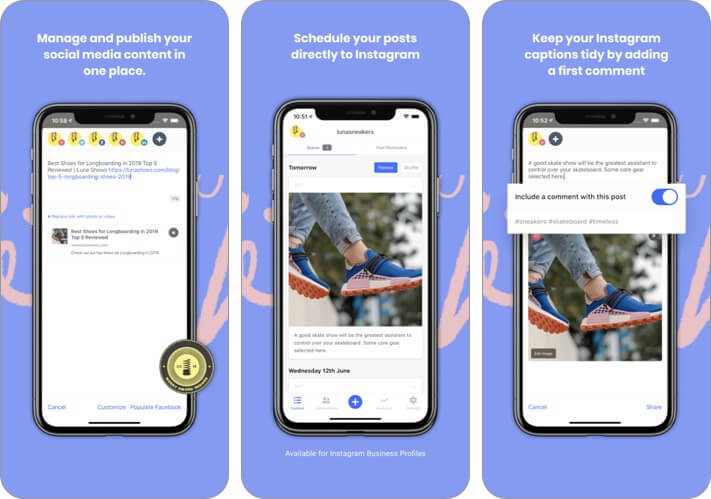 Se on liukas työkalu, jonka avulla kuvien mukauttaminen jokaiselle sosiaalisen median alustalle on helppo mukauttaa. Voit jopa esikatsella Instagram -syötettäsi ja ajoittaa ensimmäisen kommentin hashtageilla. Lisäksi voit tehdä yhteistyötä muiden kanssa, mikä on hyödyllinen, kun skaalaat blogisi. Suurin osa ominaisuuksista vaatii sinulle maksetun tilauksen, mutta se on sen arvoista, jos haluat järjestää sosiaalisen median sisältösi.