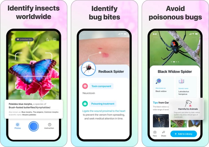 Opi yleiset ja tieteelliset nimet, lajit, kuvaukset ja ominaisuudet. Voit myös tarkastella ylimääräisiä valokuvia hyönteisestä ja etäisyyskartan siitä, missä se asuu. Tallenna tunnistetut virheet viitataksesi niihin myöhemmin, tutustu artikkeleihin, tarkista hyönteislajikkeita ja saada apua bugin puremista yhdessä kätevässä iPhone- ja iPad -sovelluksessa.