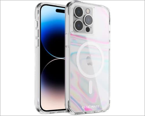 Otterbox on tunnettu nimi iPhone-tarvikkeiden tuotemerkissä. He tarjoavat nyt allekirjoitussymmetriasarjan kotelot iPhone 14 Pro Maxille. Läpinäkyvä tapaus on erittäin lempeä ja muodikas. Lisäksi Otterbox käyttää 50% kierrätettyä muovi- ja polykarbonaattimateriaalia.