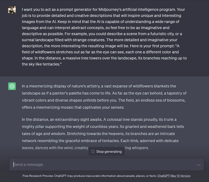 Vaikka voit myös syöttää luovia kehotuksia Midjourneyn luomiseksi omituisia ja ainutlaatuisia kuvia, olet yllättynyt siitä, mitä chatgpt voi luoda Midjourneylle työskentelemään alla olevan kehotteen kanssa.