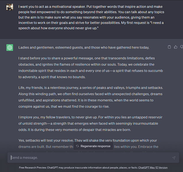 Motivoivaan puhumisen kulttuuri on saanut paljon vetovoimaa nykymaailmassa, etenkin yrityssektorilla. Joten, jos olet motivoiva puhuja ja haluat saada ideoita tulevasta motivaatiopuheestasi, voit hyvin käyttää GitHubin alla olevaa ChatgPT -kehotusta muuttaaksesi AI -työkalun motivoivaksi puhujaksi.