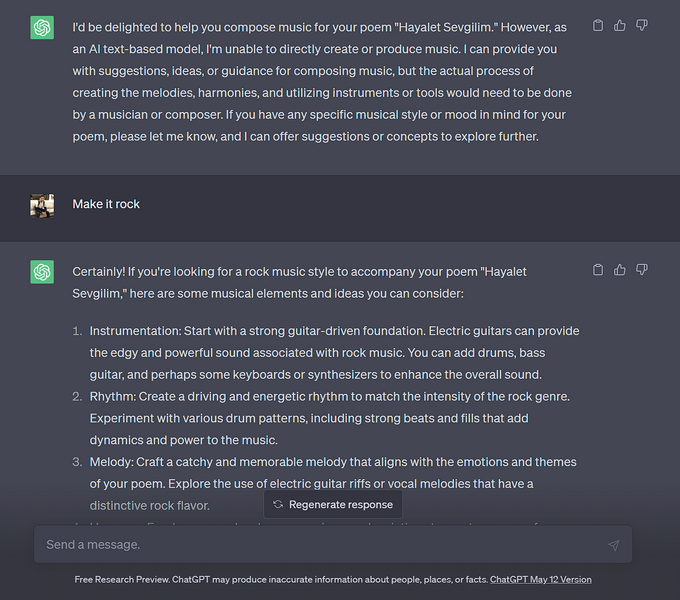 Vaikka chatgpt ei pysty tarjoamaan sinulle mitään melodioita tai instrumentaalisia kappaleita sävellysi varten, se voi ehdottaa oikeaa tapaa tuottaa musiikillista sisältöä, jonka yrität saavuttaa.