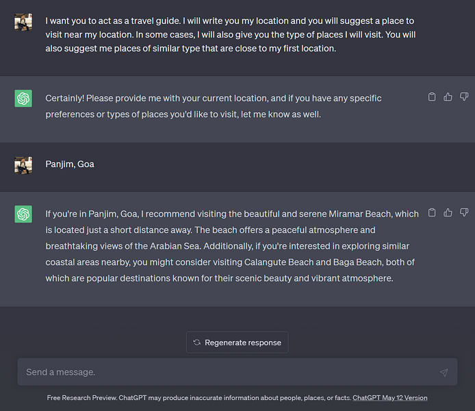 Vaikka siellä on monia GPT-pohjaisia matkasuunnittelukeskusteluja, Openain oma chatgpt ei todellakaan ole huono matkaopas. Tarvitset vain oikean kehotuksen muuttaa AI-pohjainen chatbot täysimittaiseksi matkaoppaana ja auttaa sinua kaventamaan kaupungin tai alueen vetovoimapisteitä, joihin aiot käydä lähitulevaisuudessa.