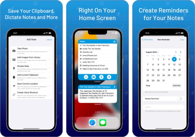 Sovellus integroituu myös muiden puhelimen sovelluksiin, kuten karttoihin ja kalenteriin. Tarkistatko kartan etäisyyden tallennetun osoitteen kautta tai asetat tapahtuman tietyllä päivämäärällä leikkauksen kautta, snipnotes on aina hyödyllisiä ehdotuksia.