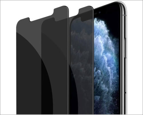 Tämä iPhone 11 Pro Maxin näytönsuoja toimii myös yksityisyyden suojaa. Se on korkealaatuinen yksityisyys karkaistu lasi, joka sallii katselun vain, kun henkilö on suoraan näytön edessä. Jos muut yrittävät huippua, he ovat vain mustanä näytön.