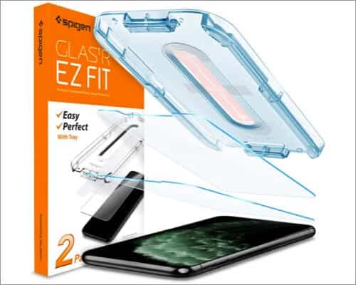 Spigen on yksi tunnetuimmista tuotemerkeistä iPhone-lisävarusteille, kuten tapauksille ja kameran linssisuojaimille. Tämä karkaistu lasin näytönsuoja on suljettu koteloon, joka toimii asennuslaitteena ja suojaa lasia, kunnes olet valmis käyttämään sitä.