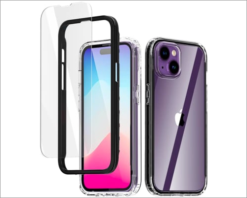 Tämän kotelon takaosa on läpinäkyvä keltaisen pinnoitteen kanssa, paljastaen iPhone 15 Plus -sovelluksen täydessä kunniassa. Siinä on myös nostettuja kehyksiä näytön ja kameran ympärillä ja ylimääräiset rypistyvät TPU-kulmat iskunvaimennukseen. Lisäksi saat sisäänrakennetun, kosketusherkän näytönsuojan.