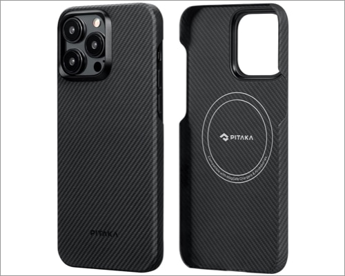 PITAKAn ohut kotelo on yksi ohuimmista mutta kestävimmistä koteloista. Se on valmistettu 600D aramidikuidusta, jota käytetään enimmäkseen ilmailu- ja sotilassovelluksissa, joten voit odottaa parempaa suojaa iPhone 15 Pro Maxille. PITAKA väittää, että se on kevyempi kuin kaksi puolen dollarin kolikkoa ja ohuempi kuin luottokortti, mikä antaa sinulle lähes kotelottoman tunteen.