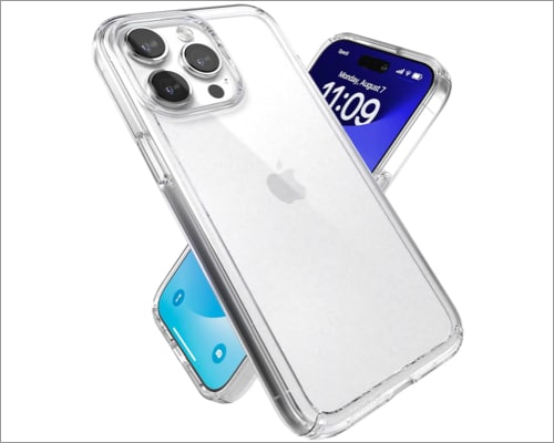 Siinä on korotettu kamerarengas, joka suojaa kameroita, kun iPhonesi putoaa. Lisäksi Speck kirkas kotelo on mukava pitää kädessä ja on samalla kevyt. Lisäksi se tukee MagSafea, joten sinun ei tarvitse huolehtia, jos sinulla on MagSafe-lisävarusteita.