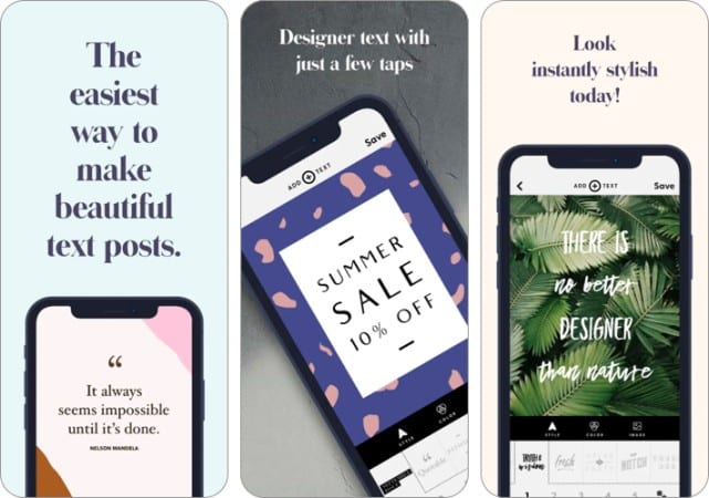 Typorama antaa sinun lisätä visuaalisesti miellyttävän tekstin valokuviin. Sen avulla voit luoda monimutkaisia tekstimerkinnöitä erilaisilla fontteilla ja kirjasintyyppeillä. Siinä on yli 50 tyyliä (mukaan lukien 3D -tyylit) ja mallit tekstin tyylin luomiseksi sinulle satunnaisesti. Lisäksi tämä sovellus voi löytää yli sata fonttia ja kirjasintyyppiä.