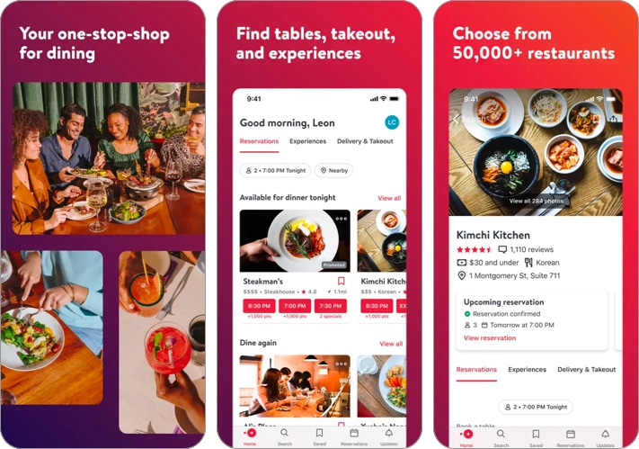 Sovelluksen avulla voit tehdä välittömiä varauksia paikallisiin ravintoloihin ja jopa hienoihin ravintoloihin, joissa vierailijoille on rajoitettu pääsy. OpenTablen avulla saat upeita alennuksia, ilmaisia aterioita ja eksklusiivisen pääsyn erityisiin kutsutapahtumiin. Portaali palkitsee käyttäjiä varausten tekemisestä, ystävien suosittelemisesta ja arvostelujen kirjoittamisesta.