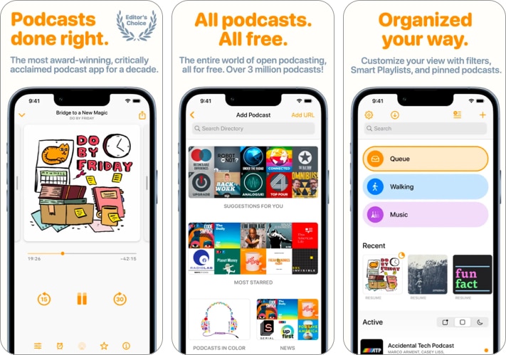 Overcast on yksinkertainen podcast-soitin, joka avaa oivaltavan äänen aarteen korvillesi, mielellesi ja sielullesi. Tässä intuitiivisessa käyttöliittymässä ilmaisessa ladattavassa sovelluksessa on valtava kirjasto tunnettuja podcast-ohjelmia. Kokoelma sisältää ääntä eri genreistä, kuten rakkaudesta, motivaatiosta, kauhusta, komediasta, tieteestä ja paljon muuta.