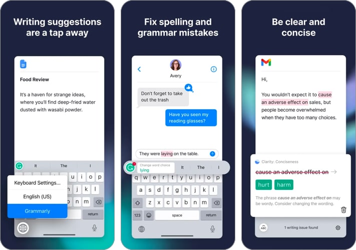 Oikeinkirjoituksen, kieliopin ja tiivistelmäehdotusten tarjoamisen lisäksi siinä on sävyn havaitseminen, teksti- ja emoji -ennusteet, älykkäät automaattiset korjaukset ja paljon muuta. Sen sovelluksessa on täysimittainen asiakirjaeditori, jolla on samat ominaisuudet kuin kieliopin verkko, mukaan lukien tilastojen kirjoittaminen, pilvipohjainen asiakirjanhallinta, kattava kirjoituspalaute ja paljon muuta.