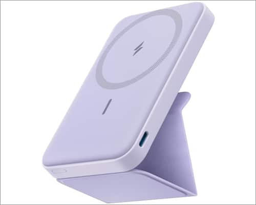 Voit vapaasti kantaa iPhoneasi napsautettuna 0,5 tuuman MagSafe-akkupakkaukseen ilman, että lataat ja rasitat kättäsi. Toinen tämän MagGo-laturin suuri USP on sisäänrakennettu taitettava jalusta, joka on kiinnitetty sen takapuolelle.