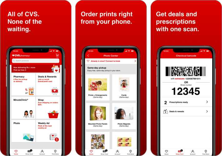 CVS -apteekki antaa sinun tehdä ennakkomaksua resepteillesi ja saada yksityinen nouto näyttämällä viivakoodisi. Voit tilata täyttöä ja seurata heidän tilaa tai historiaa. Lisäksi voit käyttää täydellisiä tietoja lääkkeestä ennen kuin lisäät sen ostoskoriin.
