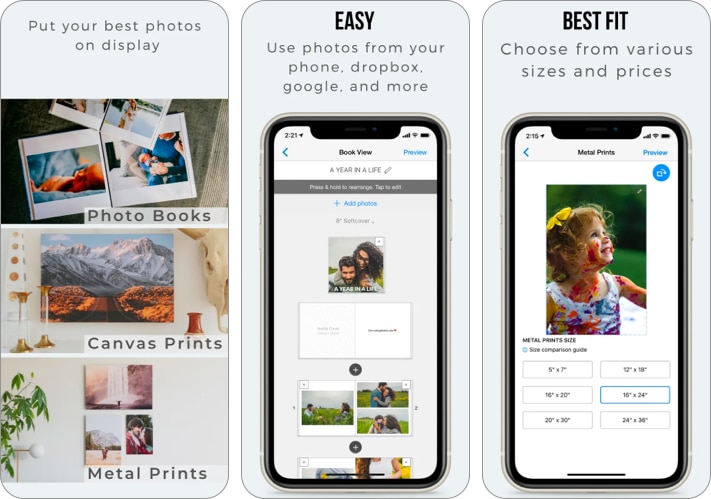 Muuta iPhone -kuvat kauniiksi valokuvakirjoiksi SimplePrints -sovelluksella. Tässä online -portaalissa on laajoja räätälöintityökaluja valokuvakirjojen, henkilökohtaisten lahjojen ja vaikuttavan seinätaidetta. Sen käyttäjäystävällinen käyttöliittymä ottaa käyttöön yksinkertaisen polun, jolla voit helposti pudottaa kuvia valokuvista, Google, Dropbox tai Socials -sovelluksesta ja aloittaa henkilökohtaisen valokuvakirjan luominen.