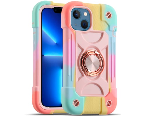 Kotelon takaosassa on 3 mm korotetut reunat ja 2 mm kohotetut reunat, mikä mahdollistaa kameran ja näytön suojauksen. Siinä on myös pyörivä rengas, joka toimii jalustana, ja kahva, joka muistuttaa pop-socketteja. Voit valita 10 värivaihtoehdosta. Jos pidät kotelon toimivuudesta, mutta haluat jotain, joka ei ole kovin unikkoinen, on värivaihtoehto musta.