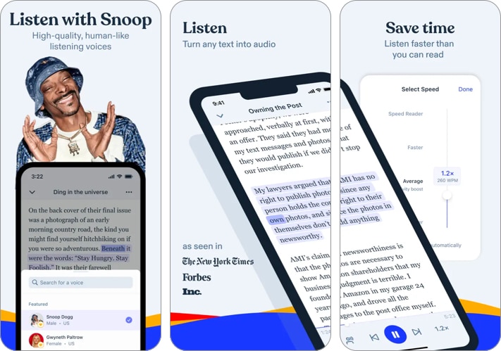 Speechify on loistava teksti-puhe-sovellus, jonka avulla voit kuunnella erityyppistä sisältöä, mukaan lukien asiakirjat, artikkelit, PDF-tiedostot, sähköpostit ja paljon muuta. Siinä on yli 20 miljoonaa käyttäjää ja se on App Storen eniten luokiteltu TTS-sovellus.