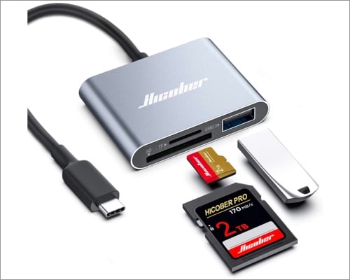 Hicober USB-C -kortinlukija on kestävä, mutta yksinkertainen ja kompakti USB-C-kortinlukija. Siinä on USB -sovitin USB -tikkuille, mikro- ja tavallisille SD -korttipaikoille sekä tavallinen SD -korttipaikka. Se sallii myös lukemisen kaikista samanaikaisesti satamista - jopa 2 kt tallennustilaa.