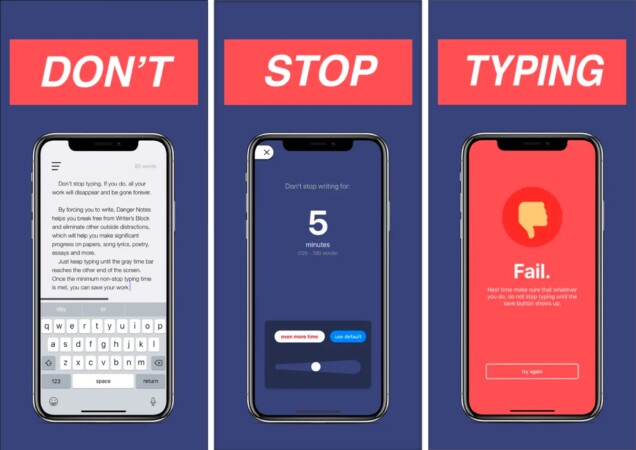 Vaarahuomautuksia pidetään välttämättömänä kirjoitussovelluksena itsensä tuhoavan ominaisuuden vuoksi. Ensinnäkin sinun on luotava ajastin muistiinpanoihisi. Sitten kirjoitettaessa punainen palkki osoittaa aina, kun pysähdyt muutaman sekunnin ajan. Jos mitään ei ole kirjoitettu, kaikki kirjoituksesi katoaa automaattisesti.