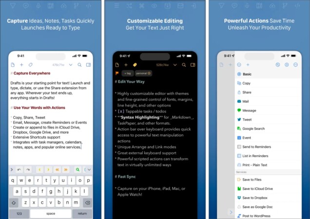 Luonnokset ovat pakollinen kirjoitussovellus kirjoittajille, jotka haluavat kaapata ajatuksensa ja kirjoittaa ideoita nopeasti ja helposti. Laajennetun sanelun ominaisuuden ansiosta voit käyttää sitä puhe-teksti-sovelluksena muistiinpanoihin. Myöhemmin voit muokata niitä kirjoitusautomaatiotyökalulla. Parasta on, että se synkronoidaan saumattomasti muiden sovellusten kanssa, mukaan lukien posti, imessage, muistutukset, tweeter, dropbox, drive, wordpress jne.