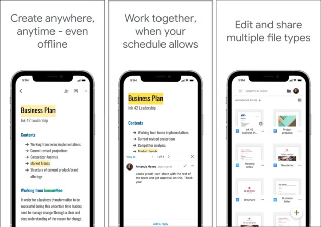 Google Docs -sovellus iPhonelle ja iPadille on erinomainen asiakirjan luomisovellus kirjoittajille. Se on luotettava ja käyttäjäystävällinen. Voit luoda, muokata ja tehdä yhteistyötä asiakirjoissa reaaliajassa. Se tarjoaa myös ammatillisia kirjoitustyökaluja, sisäänrakennetun kieliopin ja oikeinkirjoituksen tarkistajan, muotoiluvaihtoehdot ja integroidut laajennukset paremman tehokkuuden saavuttamiseksi.