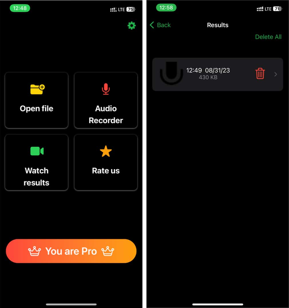 Vaikka avoin tiedosto ja arvioi Yhdysvaltain vaihtoehdot ovat itsestään selviä, äänitallentimet voivat tallentaa äänen iPhoneen tai iPadiin, ja Watch Results -vaihtoehto näyttää aiempien tallenteiden tulokset.