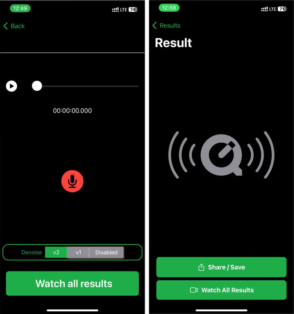 Byenoise -sovelluksen huomionarvoinen ominaisuus on AI -kohinan vähentäminen. Se voi poistaa taustamelun ääni-/videotiedostoista yhdellä napauksella. Voit ladata tiedostoja valokuvakirjastosta, tiedostosovelluksesta tai iCloudista, ja Byenoise poistaa äänet, kuten tuuli, hums, tuulettimen melu, staattinen tai buzz -melu ja paljon muuta. Voit myös valita erilaisia älykkäitä AI -melun vähentämisalgoritmeja.