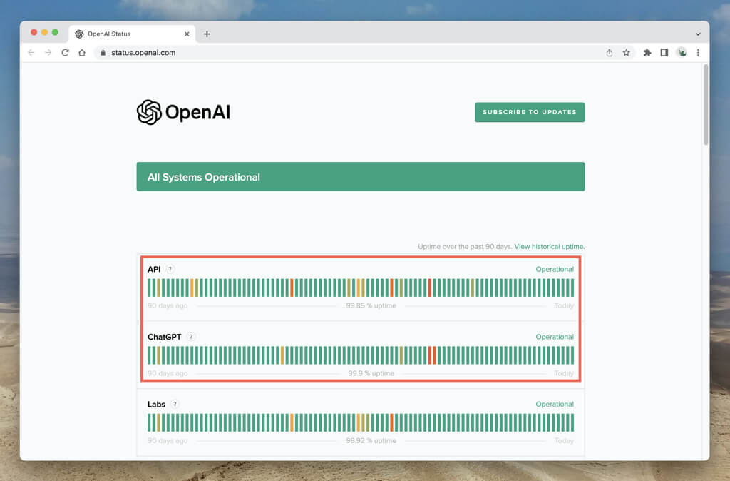 Käy Openain järjestelmän tilasivullaja tarkista, onkoChatgptJärjestelmä on toiminnassa. Tarkista myösAPITila, jos käytät CHATGPT: tä kolmannen osapuolen sovelluksen tai palvelun kautta. Jos palvelinongelmia on, odota, kunnes OpenAi saa järjestelmänsä toimimaan uudelleen.