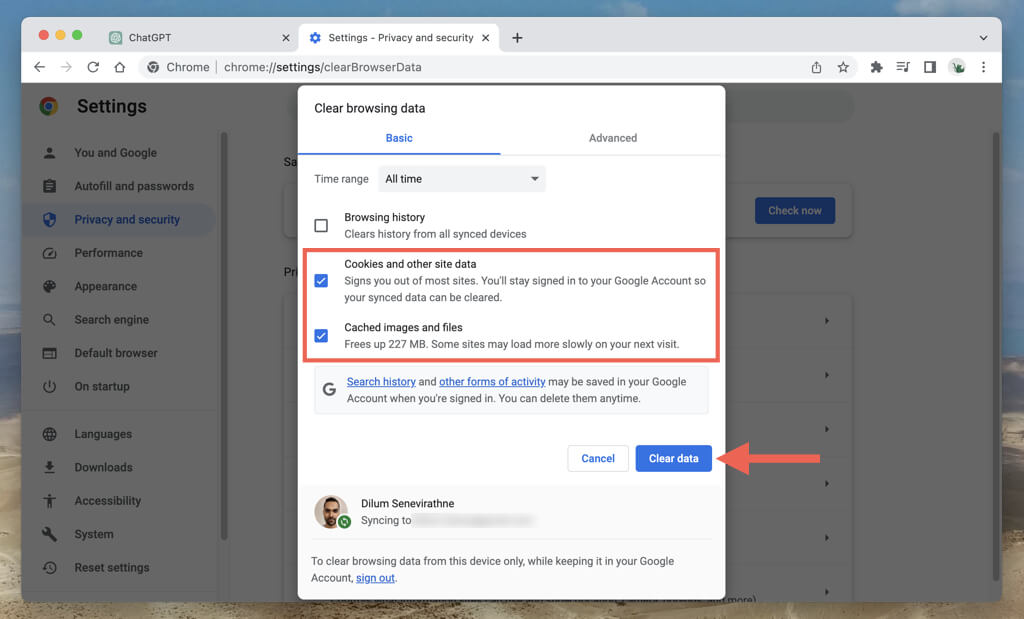 Tyhjennä selaimesi välimuisti, jos ChatgPT: n ”virheessä” -virheestä tulee toistuva ongelma. Tämä auttaa ratkaisemaan ongelmia, jotka ovat lisääntyneet vanhentuneiden tai korruptoituneiden sivustotietojen takia.