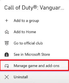 - Valitse seuraavaksi COD Vanguard -peli, napsautaValikkoPainike ja valitse Hallitse peli ja lisäosat kontekstivalikosta.