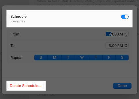 Se pysäyttää DND -tilan kytkemällä sen automaattisesti Maciin. Jos et enää tarvitse aikataulua, napsautaPoista aikatauluja vahvista valintasi napauttamallaPoista aikataulukehotuksella.