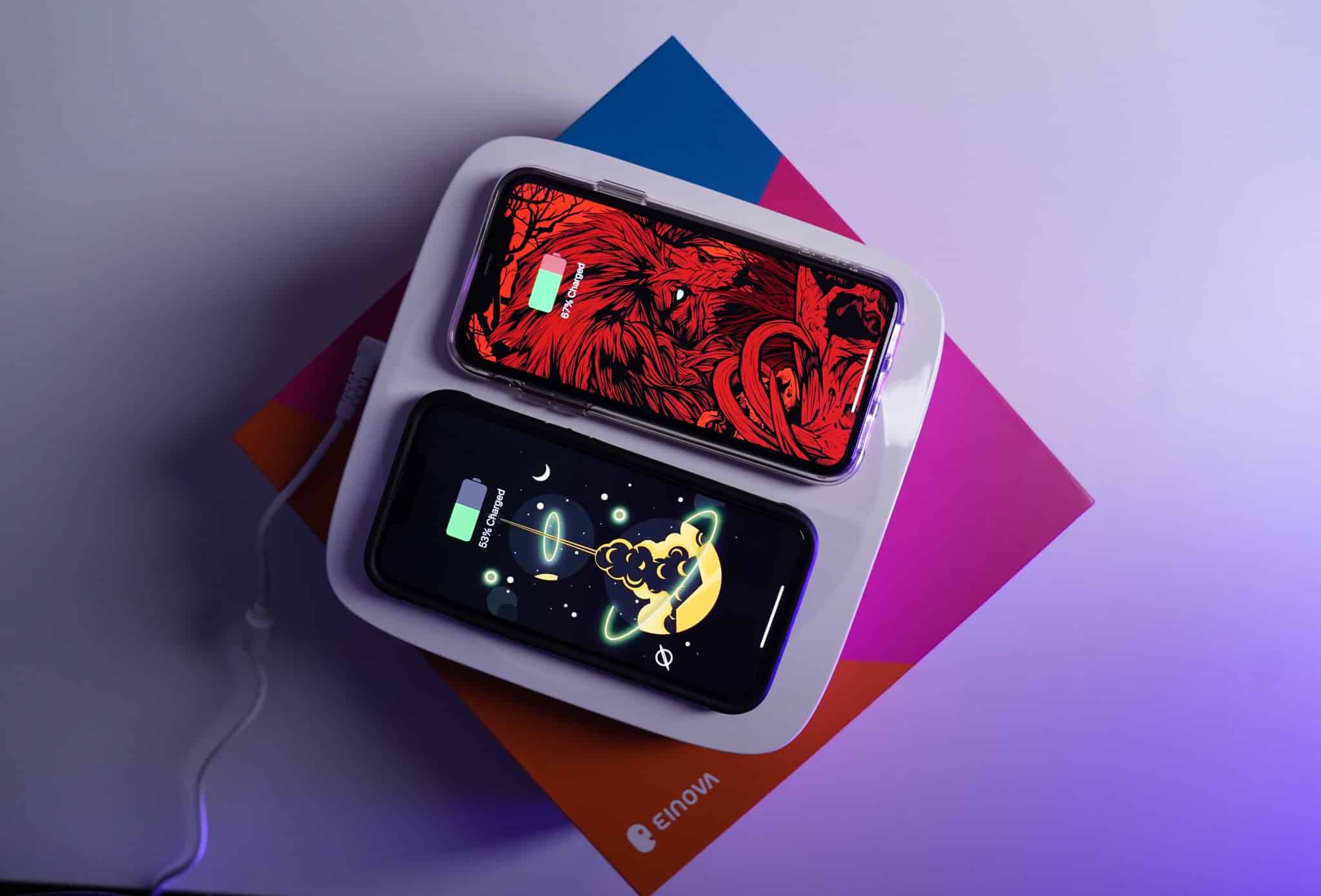 Vaikka Mundus Pro puhdistaa laitteet ja asusteet ja toimii myös lisävarusteena, se on langaton laturi juurissaan. Se voi ladata kaksi laitetta samanaikaisesti, ja yläreunassa on kaksi EINOVA -tuotemerkki -logoa, mikä osoittaa langattoman laturin sijoittelun.