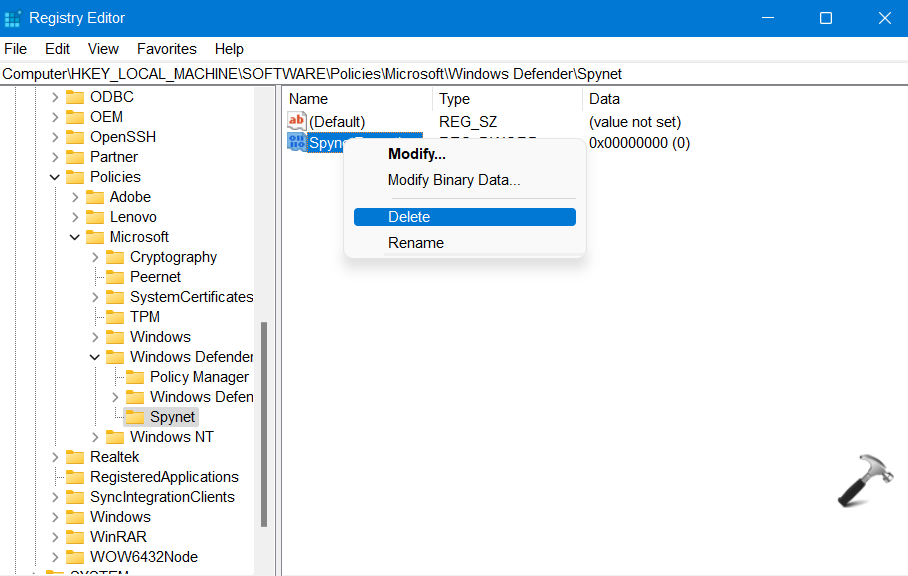 HKEY_LOCAL_MACHINESOFTWAREPoliciesMicrosoftWindows DefenderSpynet