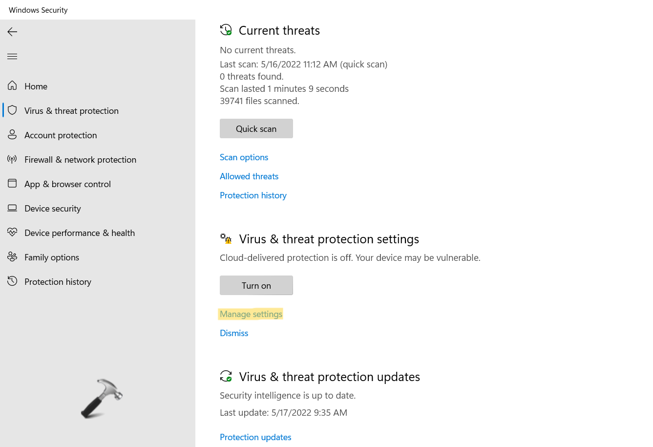 3.Napsauta nytHallitse asetuksialäsnäVirus- ja uhkien suojausasetukset.