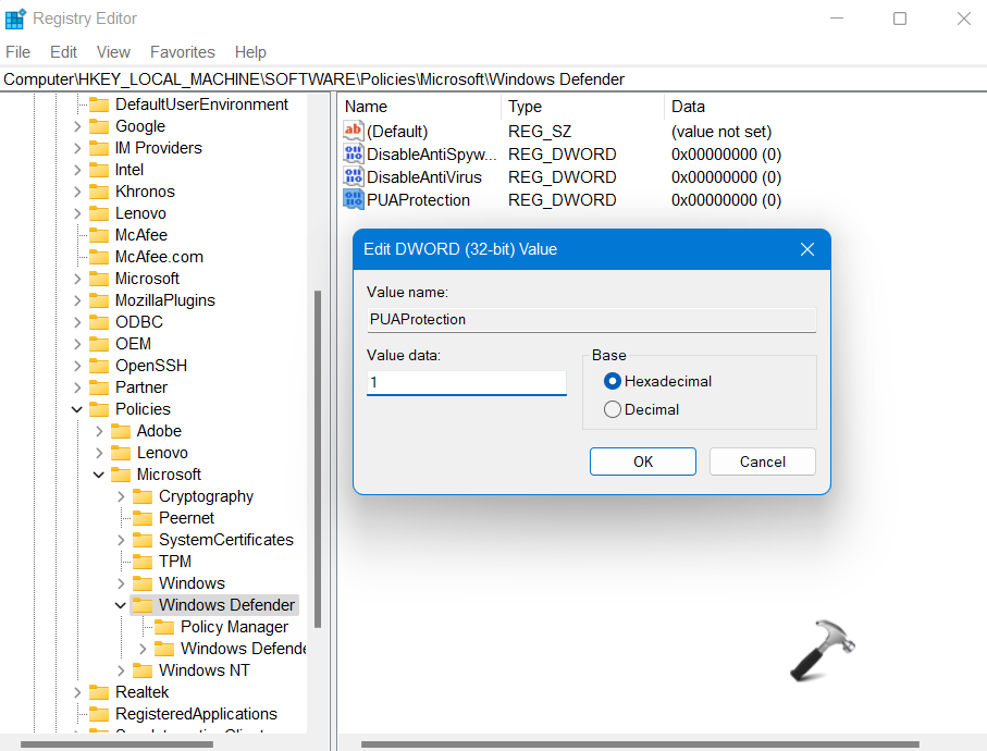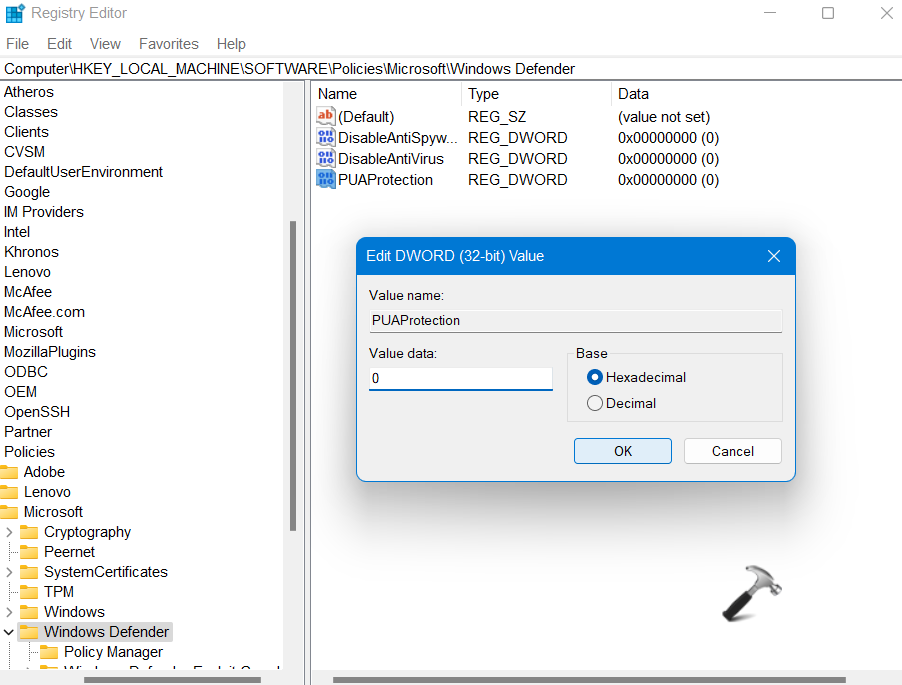 3.Kerran siellä, kaksoisnapsautaPuuhankokeusReg_dword ja muuta arvotietoaan1Microsoft Defender PUA -suojauksen avulla.
