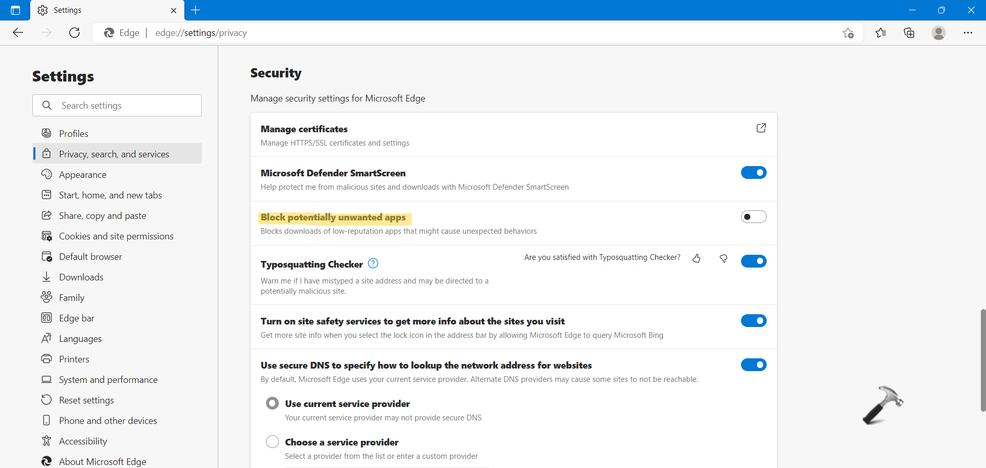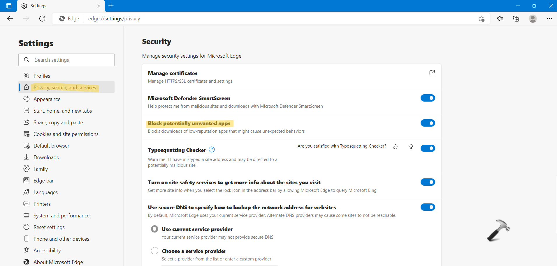 2.Napsauta seuraavaksiYksityisyys, haku ja palvelutläsnä vasemmalla puolella. Kytke suojausvälilehden allaEstää mahdollisesti ei -toivotut sovelluksetPUA -suojauksen mahdollistaminen.