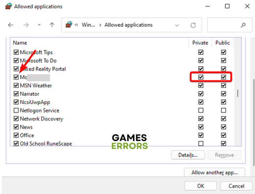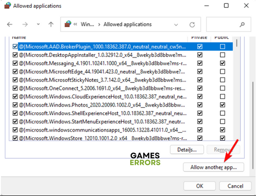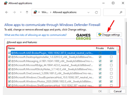 - Napsauta nyt sallitussa sovellusikkunassaVaihda asetukset. Sitten etsi peli sallittujen sovellusten ja ominaisuuksien luettelosta.