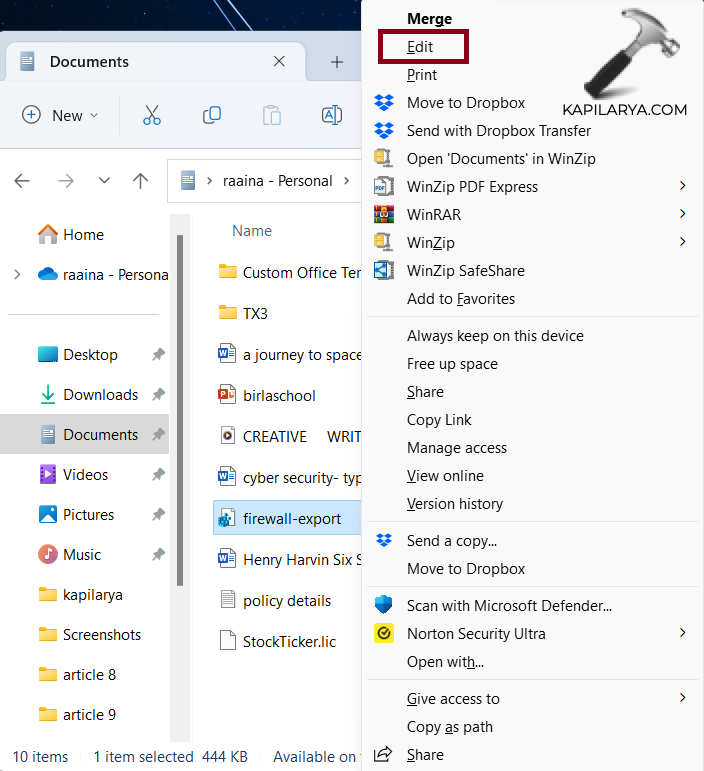3. Paina SHIFT-näppäintä + hiiren kakkospainikkeella palomuuri-export.reg-tiedostoa ja valitse “Muokkaa”.