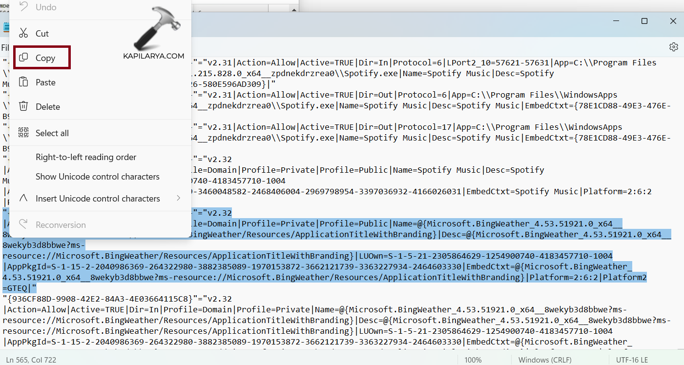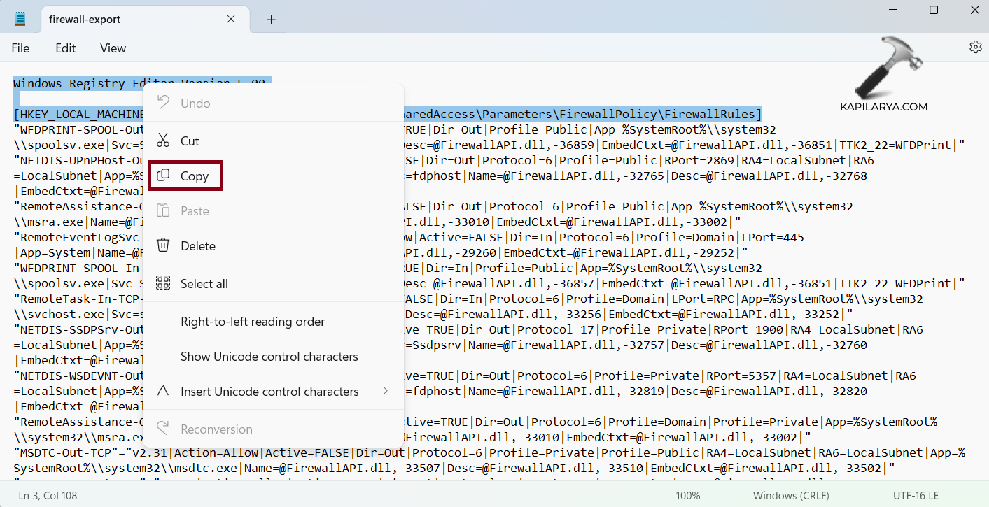 Nyt tämä vietetty tiedosto sisältää palomuurisäännöt. Seuraava vaihe on avata tämä tiedosto Notepadilla poistaaksesi merkinnät, joita ei vaadita, ja luoda uusi .REG -tiedosto vain merkinnöillä, jotka haluat tuoda järjestelmään.