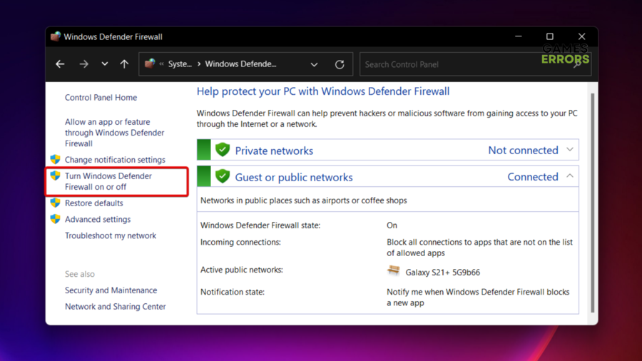 Jos saat edelleen muistipoistovirheen tai muut siihen liittyvät ongelmat, sinun tulee sammuttaa Windows Defender -palomuuri Windows -tietokoneellasi. Noudata alla olevia vaiheita: