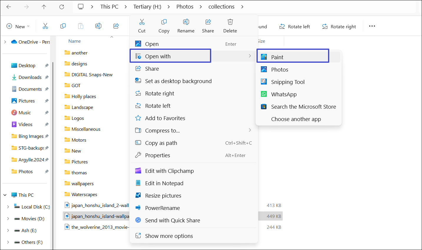 1. Napsauta hiiren kakkospainikkeella kuvaa, jonka haluat asettaa taustakuvaksi, valitse ”Avata jkn kanssa"Ja napsauta"Maali".