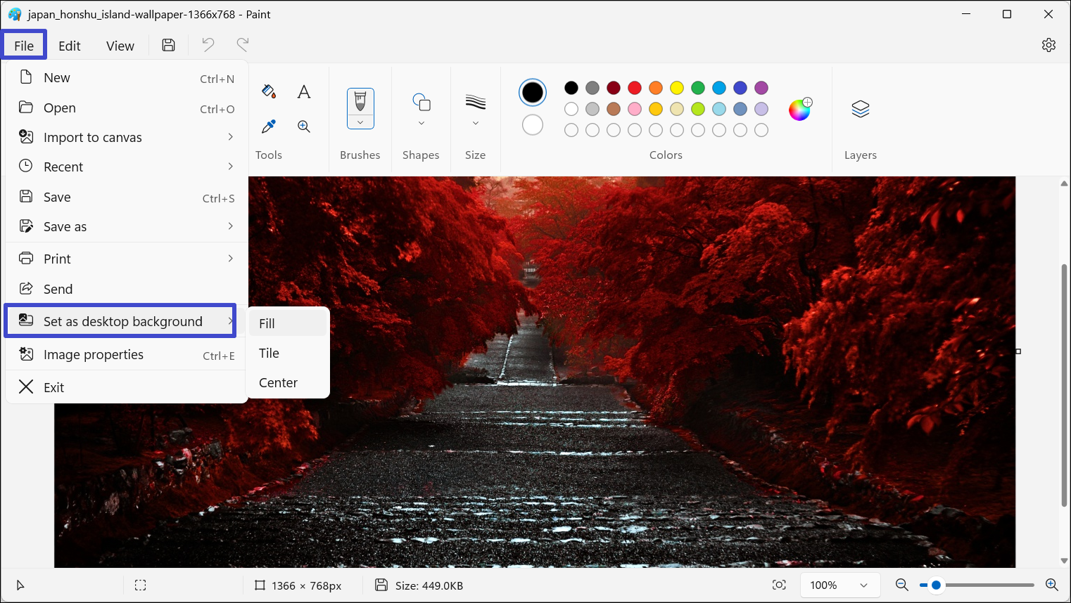 Napsauta maalisovelluksessa 2. napsauta ”Tiedosto ”valikko, leijuu "Aseta työpöydän taustaksi”Vaihtoehto ja valitse istuvuus.