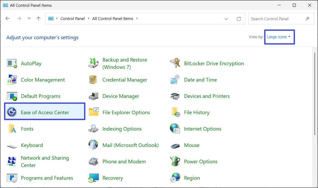 1. Avaa ohjauspaneeli, vaihda ”Katsella"Suuret kuvakkeet"Ja napsauta"Helppokäyttökeskus".