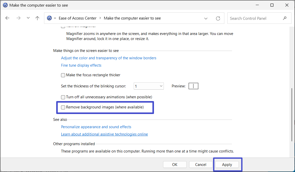 3. Poista valinta ”Poista taustakuvat (missä saatavilla) "ja napsauta ”Soveltaa ”. Napsauta sitten "Hyvä".