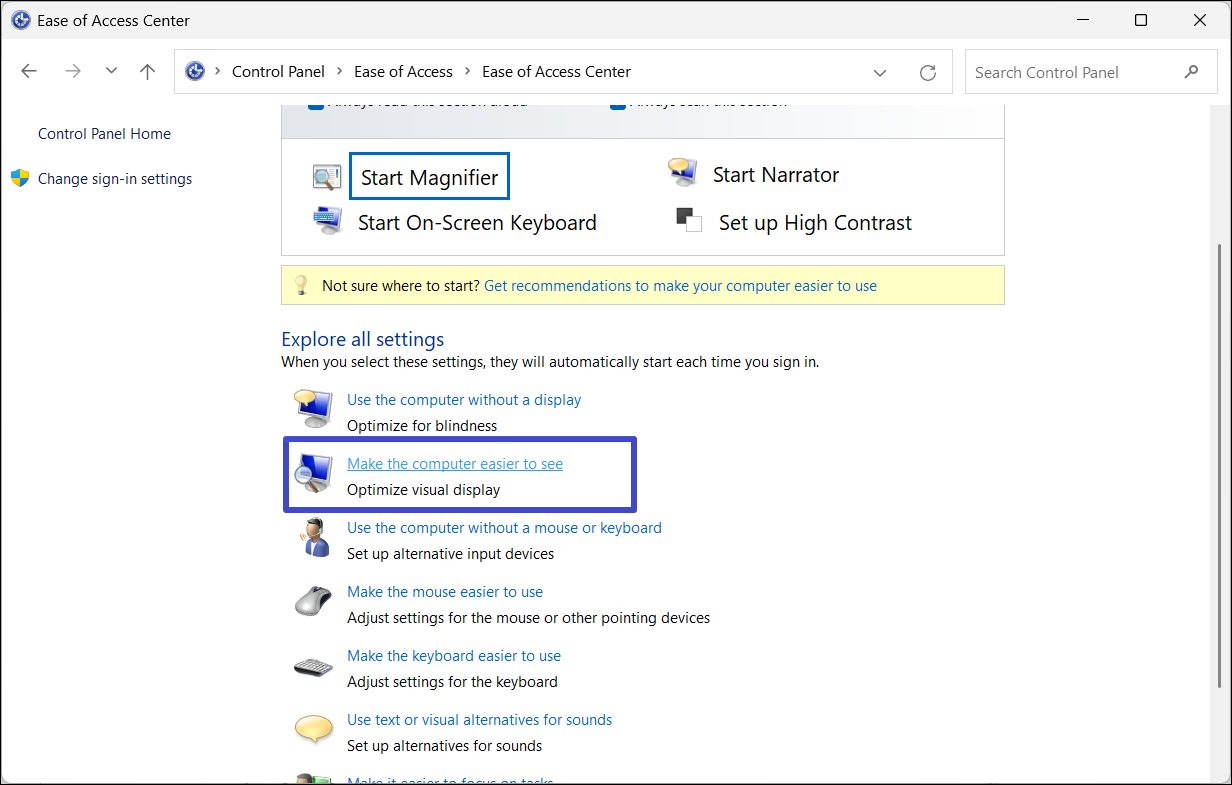 2. Kohdassa kaikki asetukset, napsauta ”Tehdä tietokoneesta helpompaa nähdä".