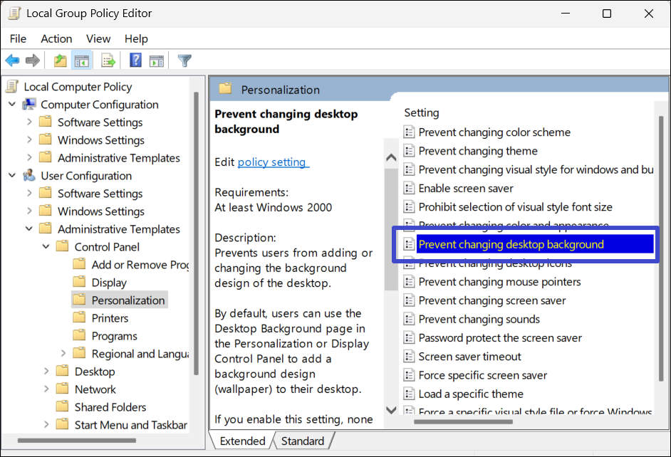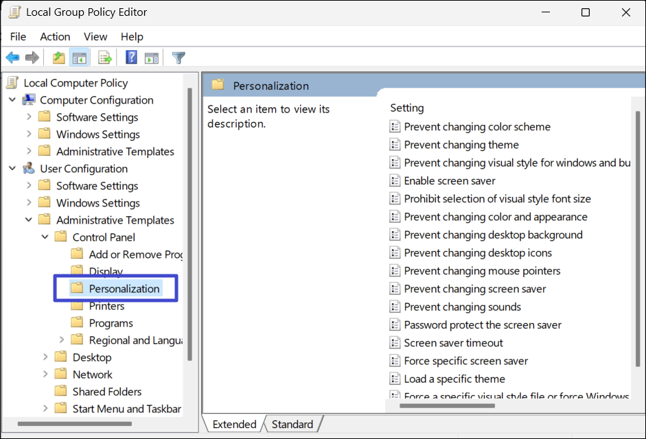 User Configuration > Administrative Templates > Control Panel > Personalization