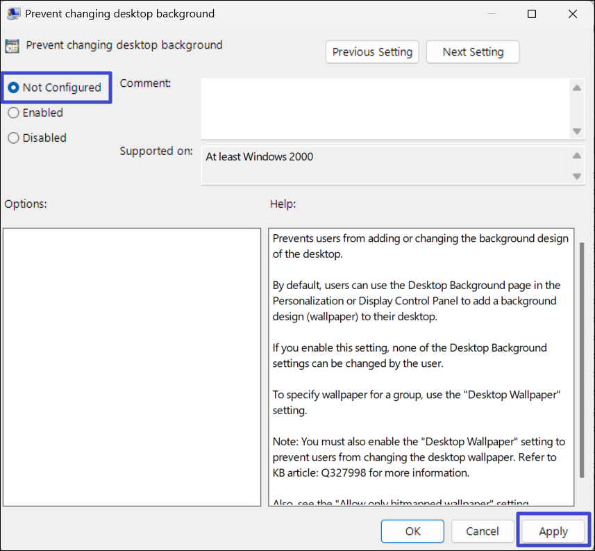 4.Ei määritetty"Tai"Vammainen"Ja napsauta"Soveltaa"Napsauta sitten"Hyvä".