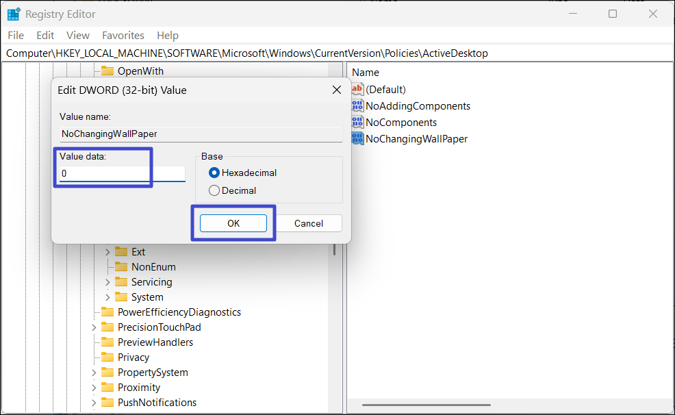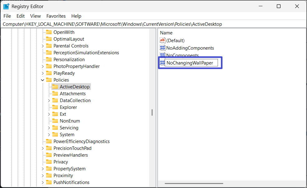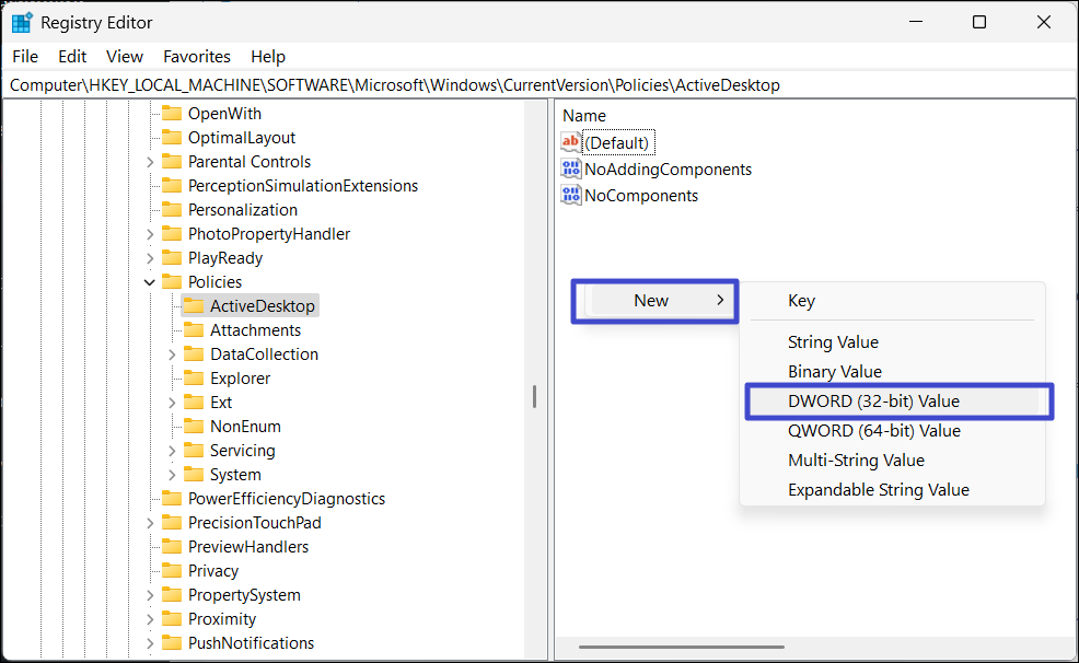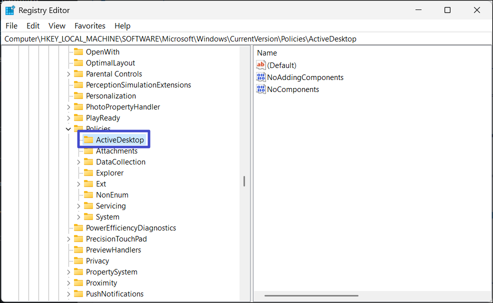 3. Politiikan alla valitse ”Activedesktop”. Jos sinulla ei ole tätä avainta, luo se.